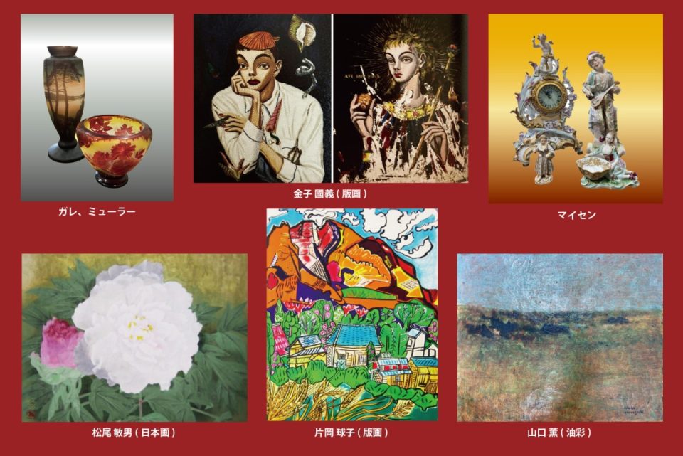 絵画、陶芸、彫刻、茶道具、西洋陶器、ガラス器、骨とう品、家具類他、おもしろ雑貨含め掘出し物約1000点を展示。人間国宝、文化勲章作家他、県内作家も多数。